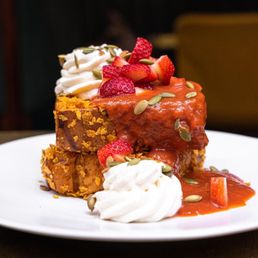 Ideally, I'd give Chica a 3.5/5. Chica at The Venetian offers a stylish escape with its dim, upscale ambiance. The atmosphere is perfect for a night out. Our server was a standout, providing excellent service and helpful recommendations. The concept of blending modern Mexican flavors with a dynamic bar program was intriguing, but it fell short of perfection in some aspects. The virgin cocktail was well-balanced, a refreshing start. However, the Paisa breakfast bowl fell flat, lacking the necessary seasoning to elevate its components. The meat was cooked well, but the dish was overall quite bland. The Chorizo & Arpa Benedict was a better choice, with the jalapeno scallion espuma adding a delightful complexity with savory and salty notes. The fried chicken and waffle was another hit-or-miss dish. The chipotle maple syrup was exceptional (sweet with a little heat), but the chicken lacked consistent crispiness. The waffle, made with Colombian bread, was an interesting twist but didn't quite hit the mark. Saving the best for last, the Buñuelo Donuts were a standout. The combination of lemon ricotta, dulce de leche, and raspberry sauce was heavenly. Though I must add that the lemon ricotta didn't stand out as much because the flavors were very mild. We couldn't resist ordering an extra side of the sauces! Overall, Chica is a good spot for brunch.
